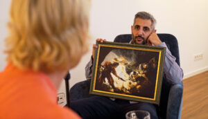 Michel Abdollahi (*1981) ist vielseitig: Moderator, Gastgeber diverser Fernseh-Shows und Gesprächs-Podcasts, entlarvender Journalist, meinungsstarker Schriftsteller und kritischer Künstler. Er ist ein einnehmender Gesprächspartner, interessierter Zuhörer und vehementer Fragensteller. Doch vor allem ist er furchtlos. Er hat keine Hemmungen, sich auf vollkommen Neues einzulassen: Wie etwa ein Blinddate mit dem Barockmaler Rembrandt. Die Begegnung mit „Die Blendung Simsons“ wurde für ihn zur Liebesgeschichte.