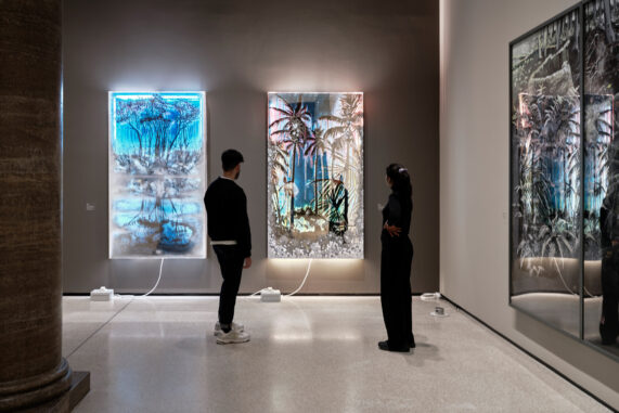 Die Illusion und das Hinterfragen der Realität sind zentrale Motive im Schaffen des Künstlers Philipp Fürhofer (*1982). An der Schnittstelle von Installation und Malerei zeigen seine Werke komplexe Bildwelten. Das Städel Museum präsentierte in einer Einzelausstellung des Künstlers insgesamt 16 Werke, darunter eine raumspezifische Arbeit. In der Sammlung Gegenwartskunst entwarf Fürhofer eine mystische Dschungellandschaft, in der nichts ist, wie es scheint. Den Besuchern strahlten Sonnenuntergänge und tropische Wälder aus Gemälden und Leuchtkästen entgegen, deren langsam pulsierendes Licht eine geheimnisvolle Atmosphäre erzeugte. Mit einer eigens für die Ausstellung konzipierten Arbeit reagierte Fürhofer zudem auf die Architektur des Raumes: Ein knapp sechs Meter hoher Vorhang griff die Motive der umliegenden vermeintlich paradiesischen Landschaften auf.