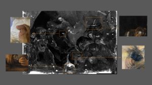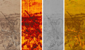 Pietro da Cortona, Alexanderschlacht; Auflicht, Durchlicht (Papierstruktur), NIR 940 (Vorzeichnung), UVF 365 nm (Bleiweißhöhungen, biologischer Befall) (v.l.n.r.)