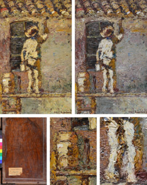 Measuring just 45.7 × 29.2 cm, the “Painter at Work on a House Wall” is small in scale. Adolphe Monticelli created it by applying extremely pastose paint to a mahogany panel that had previously served as an element of a piece of mahogany furniture. His technique evidently influenced how far more famous artists such as Vincent van Gogh handled oil paint. He applied the paint directly to the unprimed wooden surface and varnished it only in part. A complete coat of varnish was added within the framework of a later conservation measure. That varnish layer was extremely thick, particularly in the most distinctly pastose areas, and had darkened and yellowed to such a degree as to change the work’s colouration substantially.