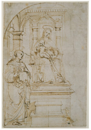 Raphael, Sketch for an enthroned Virgin and Child with Saint Nicholas of Tolentino, ca. 1502–1504, Brown ink over black pen and leadpoint, acquired in 1850 from the collection of King William II of the Netherlands