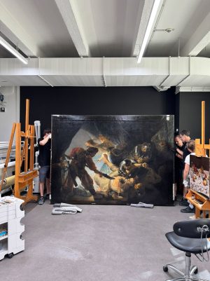 The monumental history painting, measuring over two metres in height and more than three metres in width, is one of the central masterpieces of European art history. Previous restorations and natural ageing processes have left their mark on the painting.